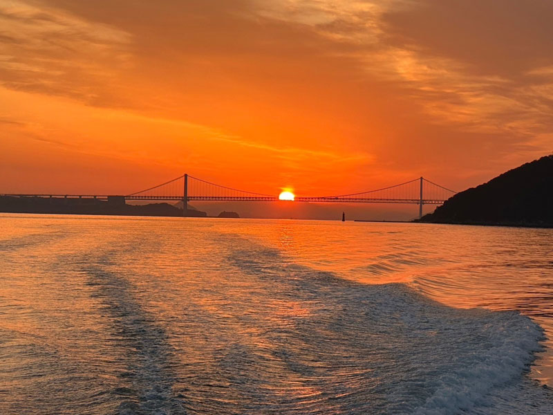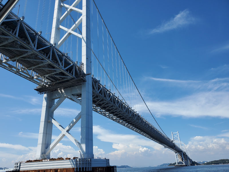 海峡部に架かる吊り橋、斜張橋、トラス橋など6種類の橋梁が連なっており、海上から見上げる景観は圧巻です。
